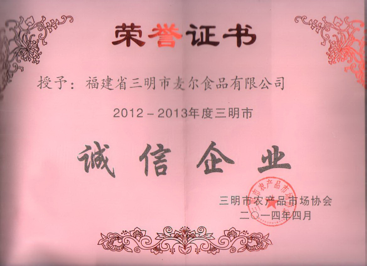 2014年9月12日,從三明市農(nóng)產(chǎn)品市場協(xié)會得知,公司被授予“2012~2013年度誠信企業(yè)”稱號。