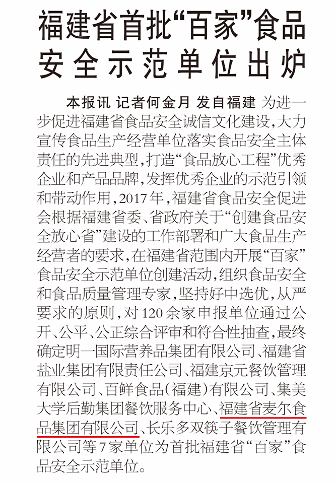 2017年,福建省食品安全促進會根據(jù)福建省委、省政府關(guān)于“創(chuàng)建食品安全放心省”建設(shè)的工作部署和廣大食品生產(chǎn)經(jīng)營者的要求,在福建省范圍內(nèi)開展“百家”食品安全示范單位創(chuàng)建活動。福建省麥爾食品集團有限公司榮獲“首批福建省“百家”食品安全示范單位”。
