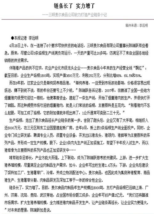 2013年5月2日,《三明日報》頭版頭條刊登了題為“鏈條長了,實力增了”的文章,全面反映了我司的經(jīng)濟效益和社會效益的發(fā)展狀況。文章如下: