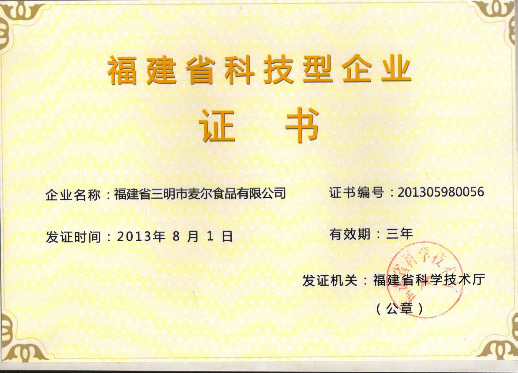 2014年1月9日,我司被福建省科學技術廳授予“福建省科技型企業(yè)”稱號。